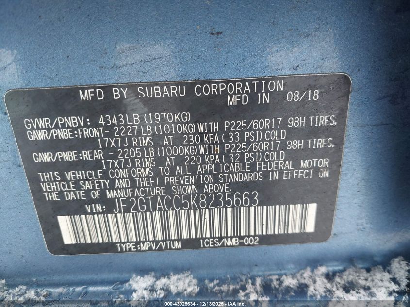 2019 SUBARU CROSSTREK 2019 року Бензин, 2.0, Повний привід, vin - JF2GTACC5K8235663 з США