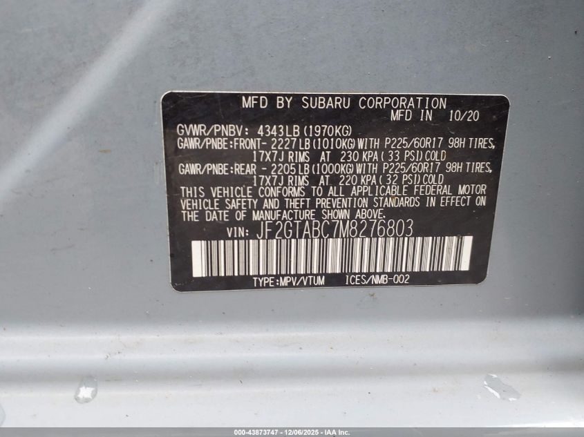2021 SUBARU CROSSTREK 2021 року Бензин, 2.0, Повний привід, vin - JF2GTABC7M8276803 з США