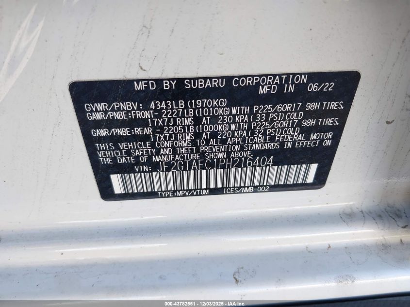 2023 SUBARU CROSSTREK 2023 року Бензин, 2.0, Повний привід, vin - JF2GTAEC1PH216404 з США