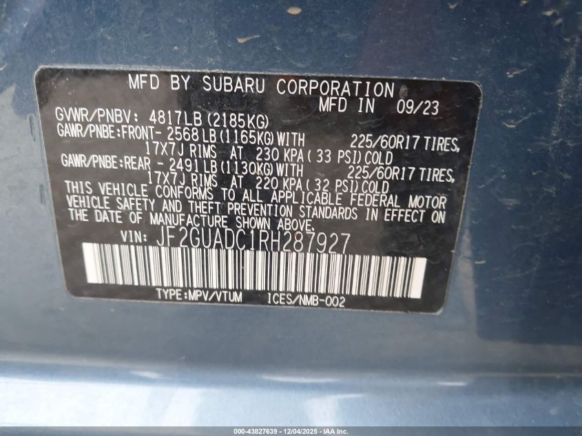2024 SUBARU CROSSTREK 2024 року Бензин, 2.0, Повний привід, vin - JF2GUADC1RH287927 з США