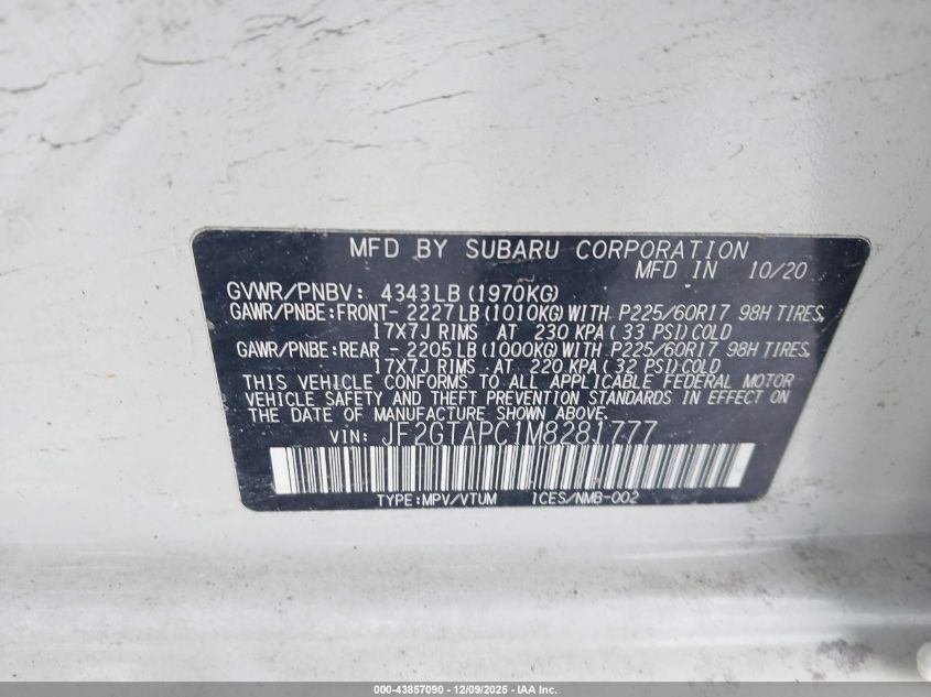 2021 SUBARU CROSSTREK 2021 року Бензин, 2.0, Повний привід, vin - JF2GTAPC1M8281777 з США