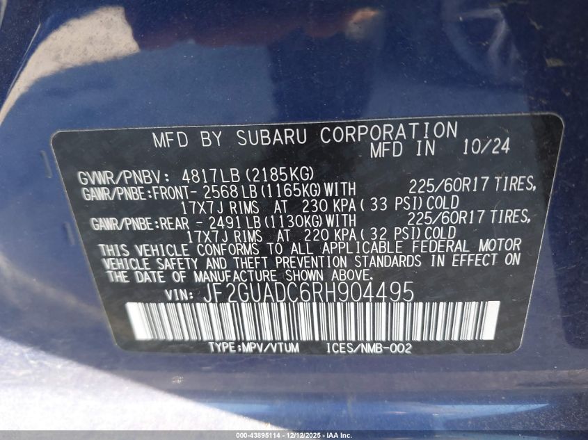 2024 SUBARU CROSSTREK 2024 року Бензин, 2.0, Повний привід, vin - JF2GUADC6RH904495 з США