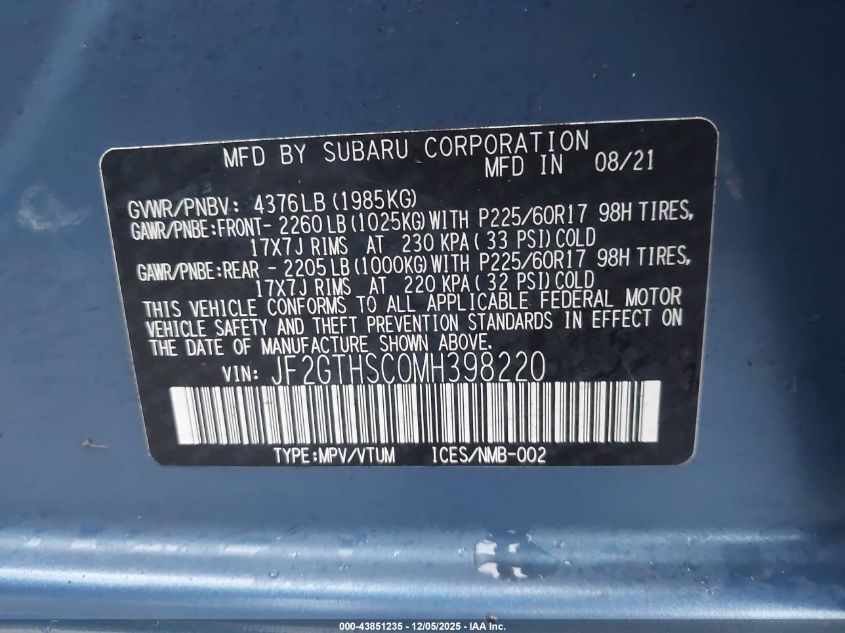 2021 SUBARU CROSSTREK 2021 року Бензин, 2.5, Повний привід, vin - JF2GTHSC0MH398220 з США