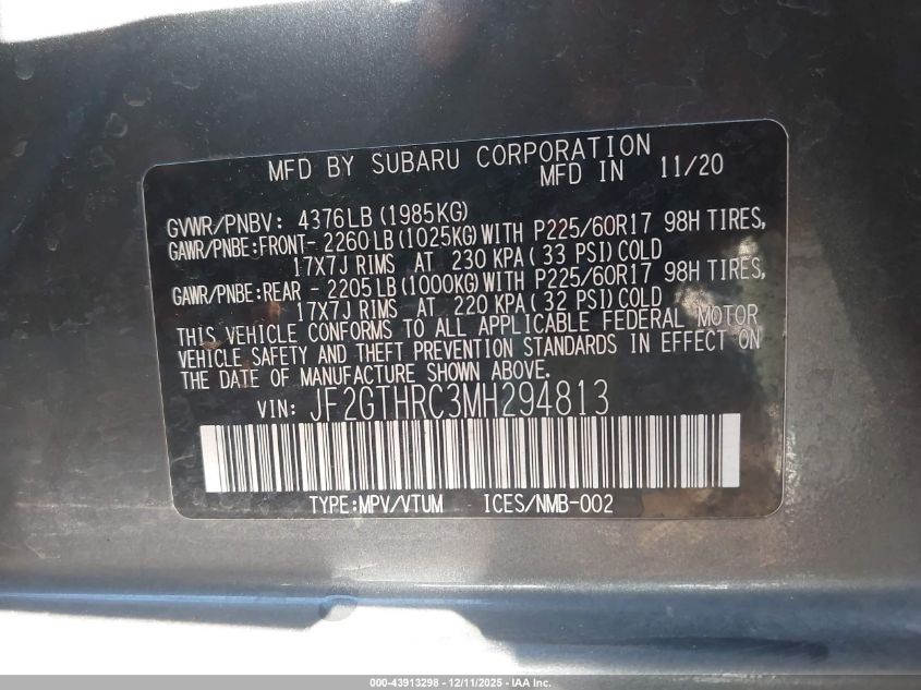 2021 SUBARU CROSSTREK 2021 року Бензин, 2.5, Повний привід, vin - JF2GTHRC3MH294813 з США