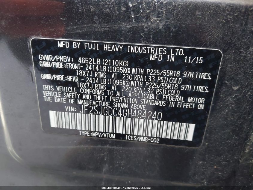 Колір СірийЦиліндри 4Привід Повний привідVIN JF2SJGDC4GH484240Стан Заводиться та їде (перевірено)Ушкодження Задня AutoRIA