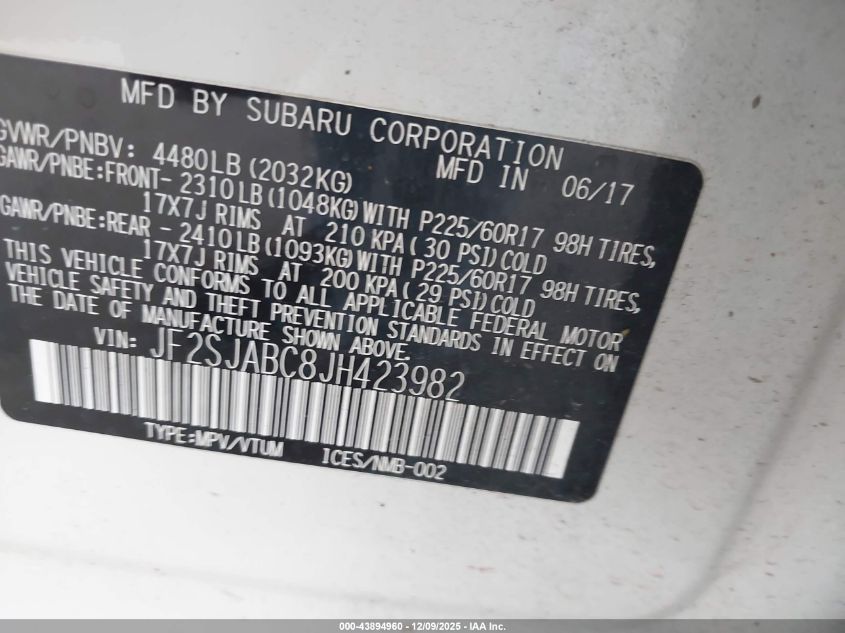 Колір БілийЦиліндри 4Привід Повний привідVIN JF2SJABC8JH423982Стан Заводиться та їде (перевірено)Ушкодження Передня або задня AutoRIA