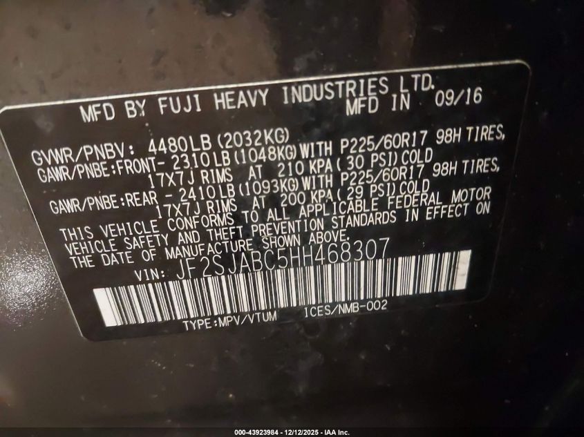 2017 SUBARU FORESTER 2017 року Бензин, 2.5, Повний привід, vin - JF2SJABC5HH468307 з США