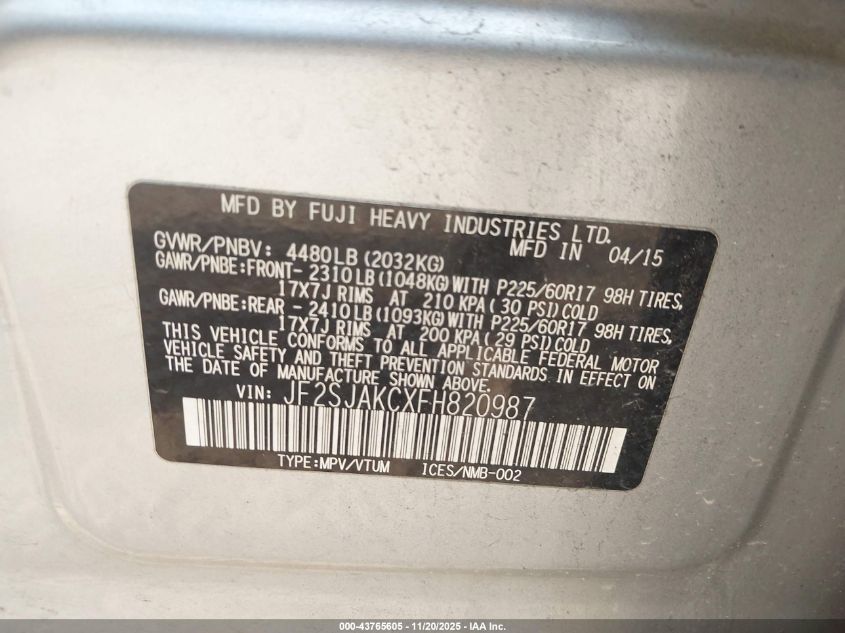 2015 SUBARU FORESTER 2015 року Бензин, 2.5, Повний привід, vin - JF2SJAKCXFH820987 з США