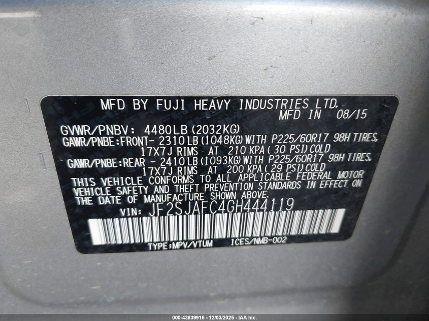 Колір СрібнийЦиліндри 4Привід Повний привідVIN JF2SJAFC4GH444119Стан Заводиться та їде (перевірено)Ушкодження Права сторона AutoRIA