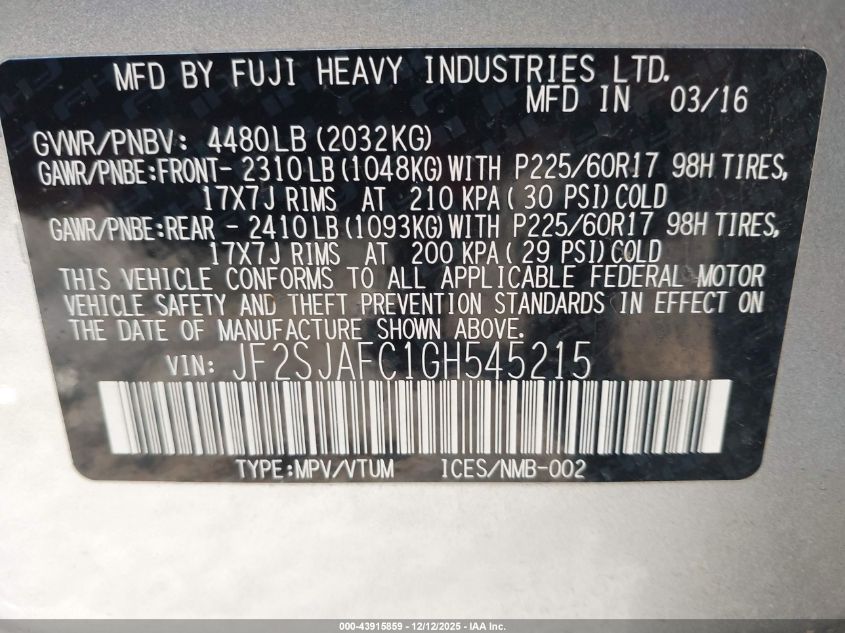 Колір СрібнийЦиліндри 4Привід Повний привідVIN JF2SJAFC1GH545215Стан Заводиться та їде (перевірено)Ушкодження Передня ліва AutoRIA