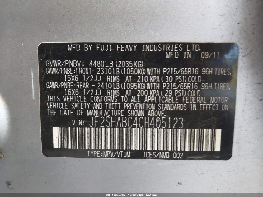 Колір СрібнийЦиліндри 4Привід Повний привідVIN JF2SHABC4CH405123Стан СтаціонарноУшкодження Передня і задня AutoRIA