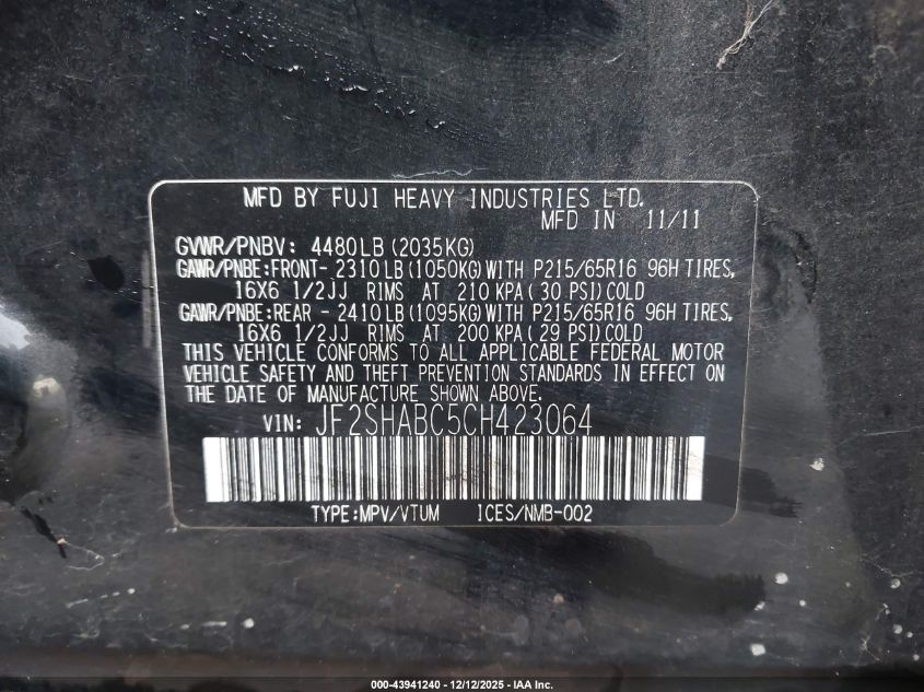 Колір ЧорнийЦиліндри 4Привід Повний привідVIN JF2SHABC5CH423064Стан СтаціонарноУшкодження Біо/Хімічні AutoRIA