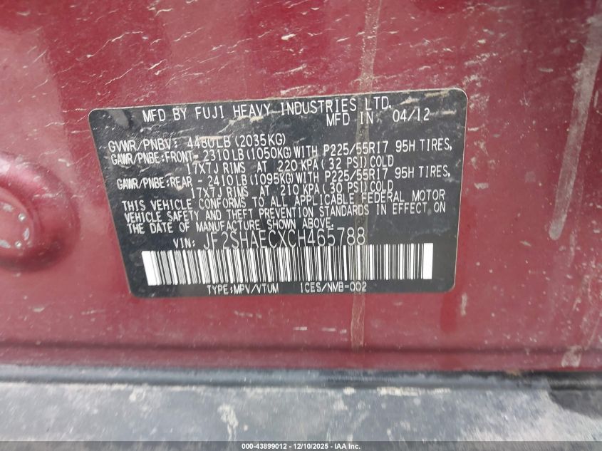 Колір ЧервонийЦиліндри 4Привід Повний привідVIN JF2SHAECXCH465788Стан Заводиться та їде (перевірено)Ушкодження Ліва сторона AutoRIA