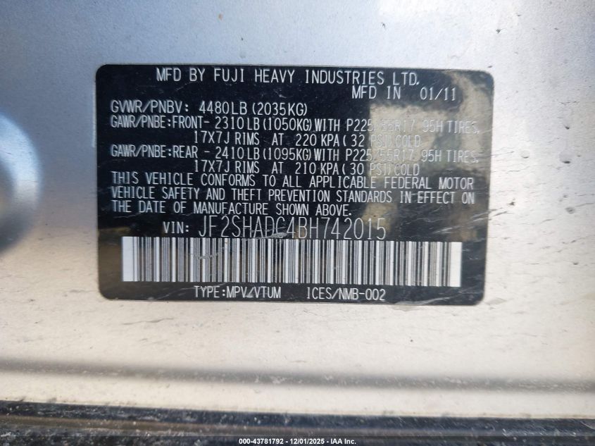 Колір СрібнийЦиліндри 4Привід Повний привідVIN JF2SHADC4BH742015Стан ЗаводитьсяУшкодження Передня або задня AutoRIA