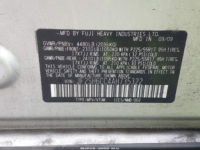 Колір СрібнийЦиліндри 4Привід Повний привідVIN JF2SH6CC4AH735322Стан СтаціонарноУшкодження Передня ліва AutoRIA