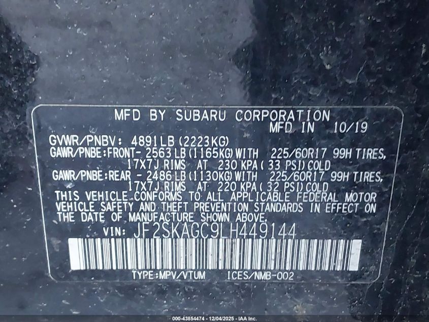 2020 SUBARU FORESTER 2020 року Бензин, 2.5, Повний привід, vin - JF2SKAGC9LH449144 з США