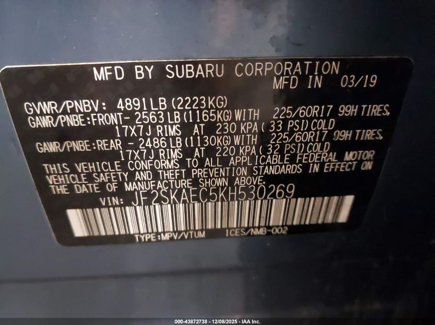2019 SUBARU FORESTER 2019 року Бензин, 2.5, Повний привід, vin - JF2SKAEC5KH530269 з США