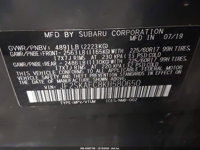 2019 SUBARU FORESTER 2019 року Бензин, 2.5, Повний привід, vin - JF2SKAEC8KH580650 з США
