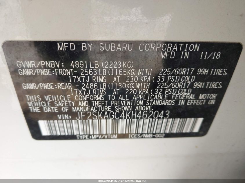 2019 SUBARU FORESTER 2019 року Бензин, 2.5, Повний привід, vin - JF2SKAGC4KH462043 з США