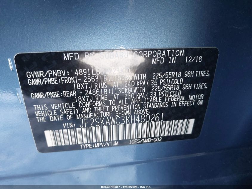 2019 SUBARU FORESTER 2019 року Бензин, 2.5, Повний привід, vin - JF2SKAWC3KH480261 з США