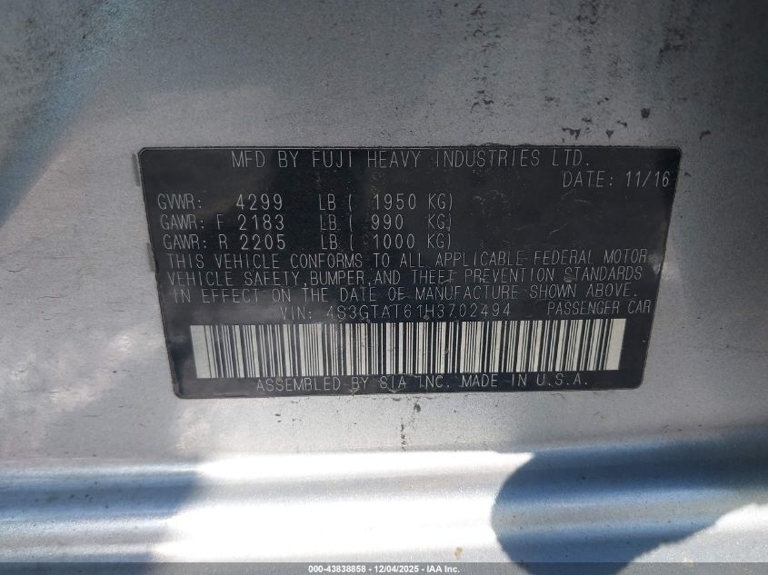 2017 SUBARU IMPREZA 2017 року Бензин, 2.0, Повний привід, vin - 4S3GTAT61H3702494 з США