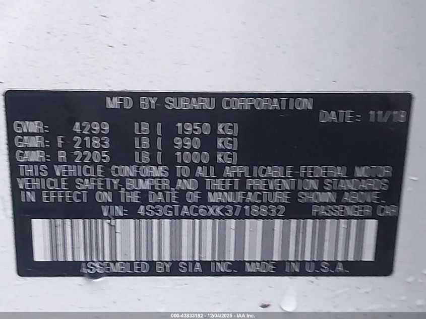 2019 SUBARU IMPREZA 2019 року Бензин, 2.0, Повний привід, vin - 4S3GTAC6XK3718832 з США
