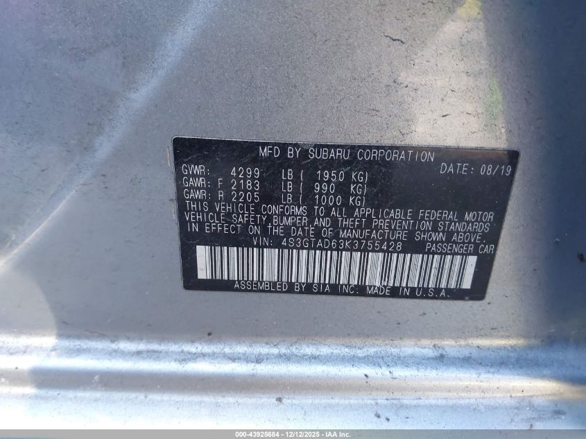 2019 SUBARU IMPREZA 2019 року Бензин, 2.0, Повний привід, vin - 4S3GTAD63K3755428 з США