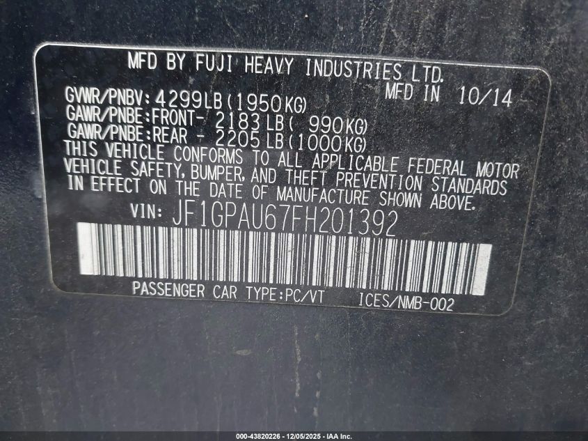 2015 SUBARU IMPREZA 2015 року Бензин, 2.0, Повний привід, vin - JF1GPAU67FH201392 з США