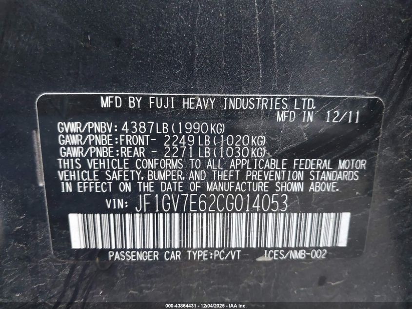 2012 SUBARU IMPREZA 2012 року Бензин, 2.5, Повний привід, vin - JF1GV7E62CG014053 з США