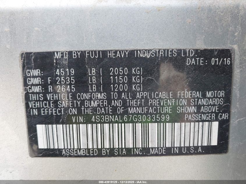 2016 SUBARU LEGACY 2016 року Бензин, 2.5, Повний привід, vin - 4S3BNAL67G3033599 з США