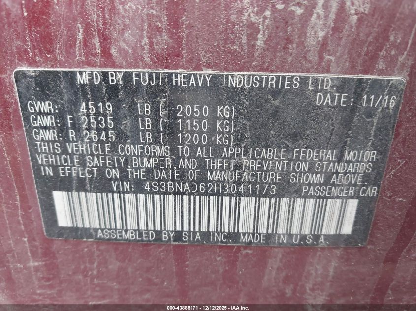 2017 SUBARU LEGACY 2017 року Бензин, 2.5, Повний привід, vin - 4S3BNAD62H3041173 з США