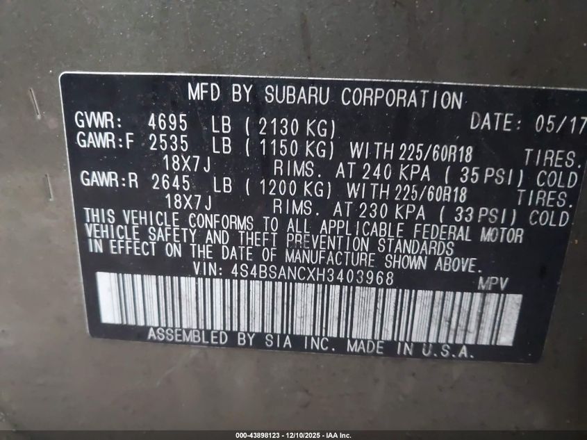 2017 SUBARU OUTBACK 2.5I