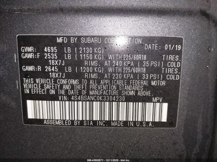 2019 SUBARU OUTBACK 2.5I PREMIUM