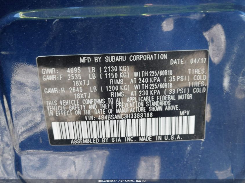 2017 SUBARU OUTBACK 2017 року Бензин, 2.5, Повний привід, vin - 4S4BSANC3H3383188 з США