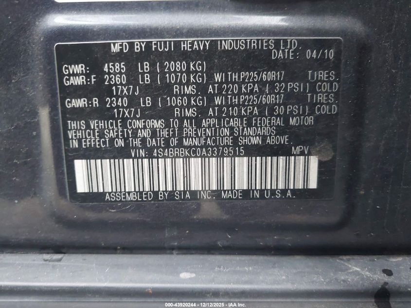 2010 SUBARU OUTBACK 3.6R LIMITED