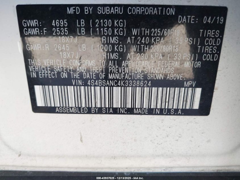 2019 SUBARU OUTBACK 2.5I PREMIUM