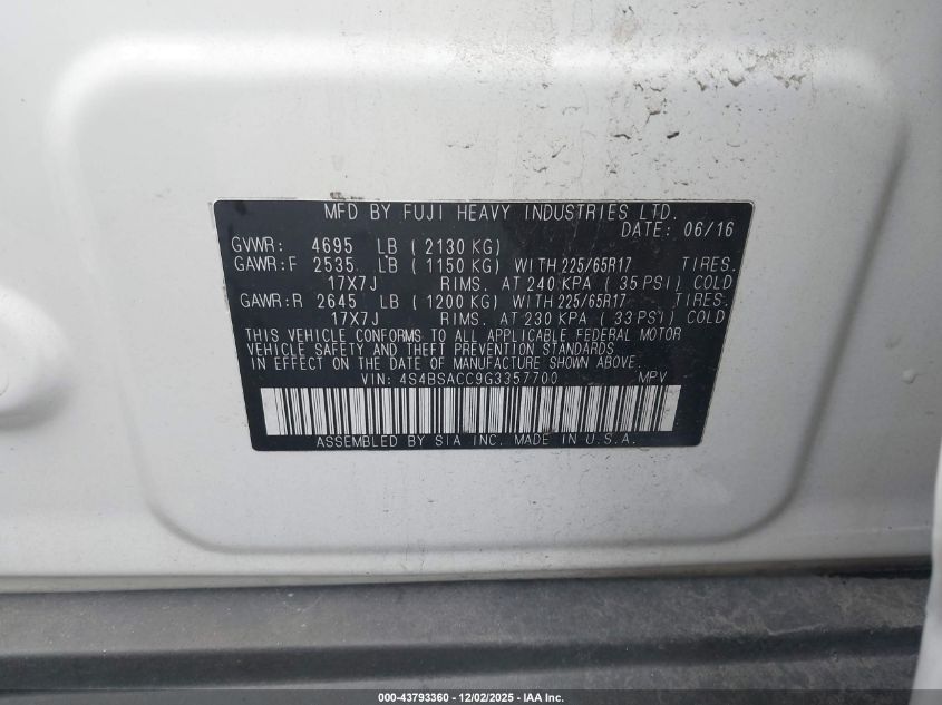 2016 SUBARU OUTBACK 2.5I LIMITED