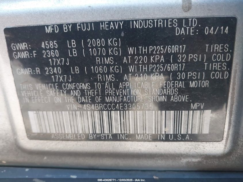 2014 SUBARU OUTBACK 2014 року Бензин, 2.5, Повний привід, vin - 4S4BRCCC4E3305735 з США