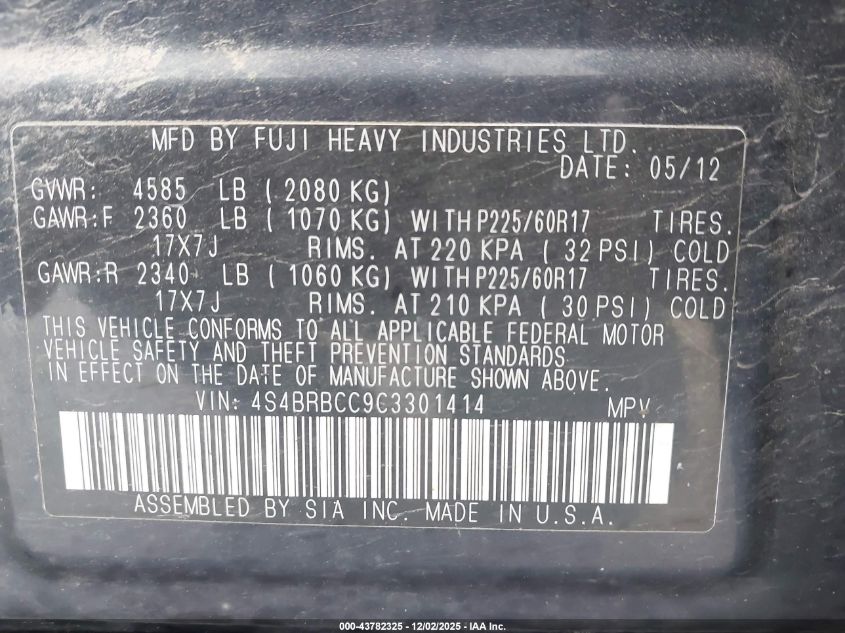 2012 SUBARU OUTBACK 2.5I PREMIUM