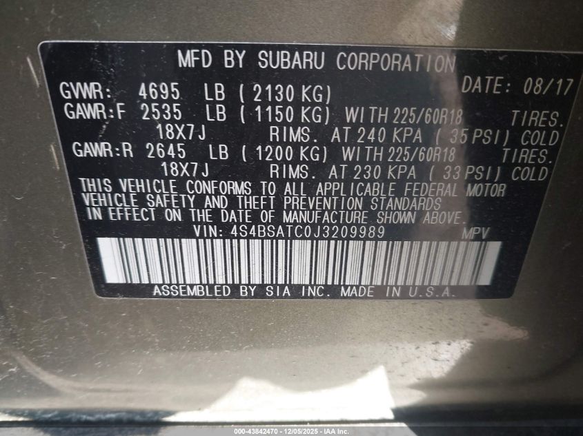 2018 SUBARU OUTBACK 2018 року Бензин, 2.5, Повний привід, vin - 4S4BSATC0J3209989 з США