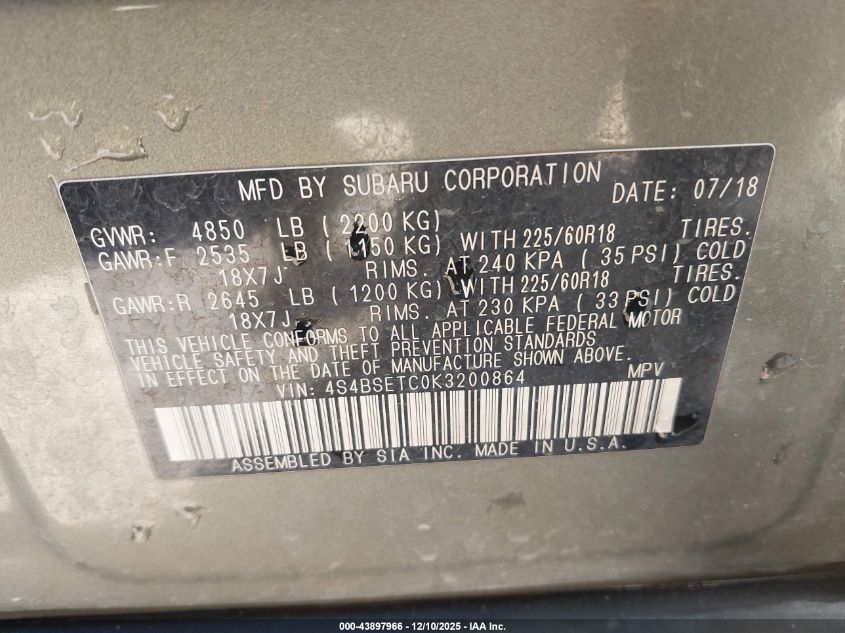 2019 SUBARU OUTBACK 2.5I PREMIUM