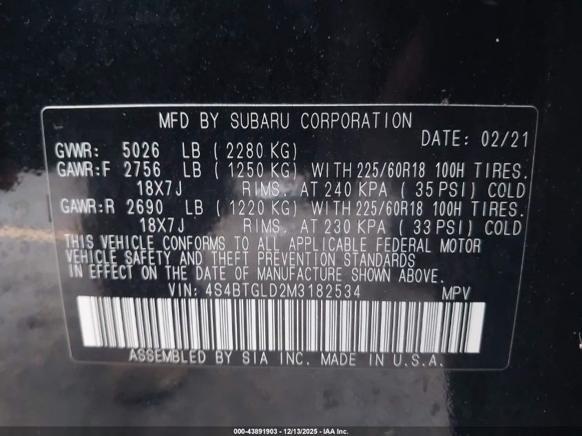 2021 SUBARU OUTBACK 2021 року Бензин, 2.4, Повний привід, vin - 4S4BTGLD2M3182534 з США