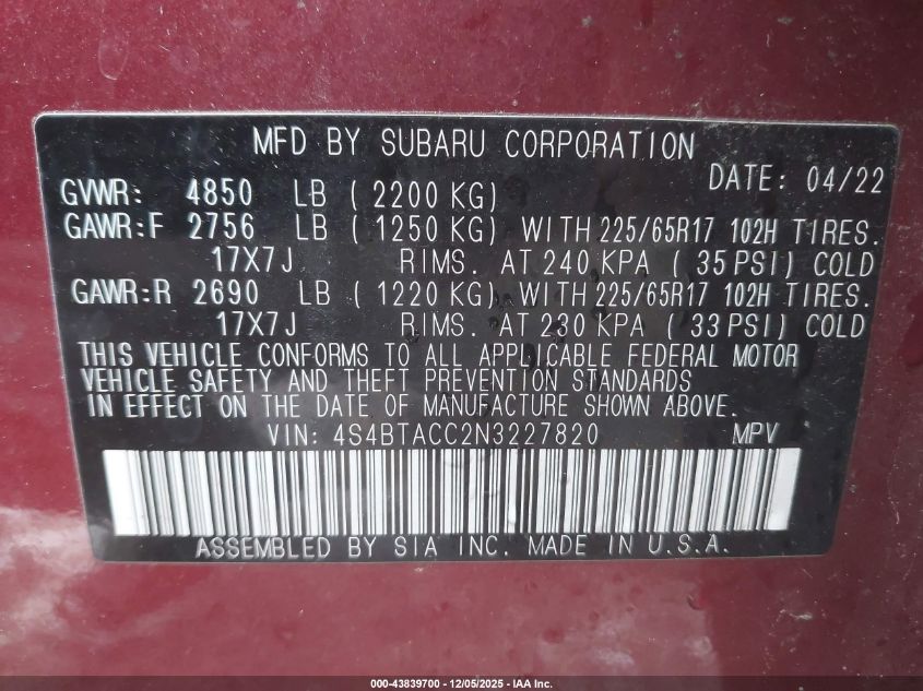 2022 SUBARU OUTBACK 2022 року Бензин, 2.5, Повний привід, vin - 4S4BTACC2N3227820 з США