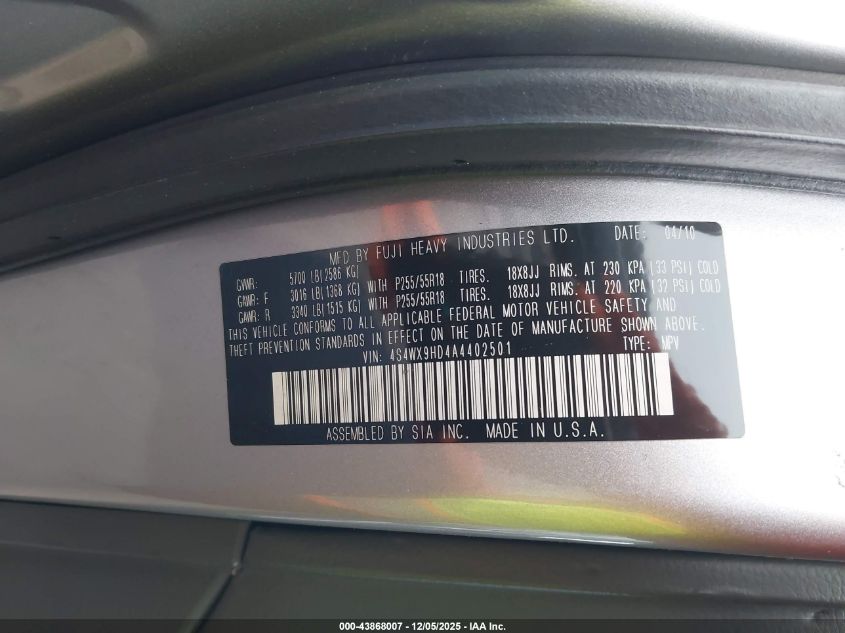 2010 SUBARU TRIBECA 2010 року Бензин, 3.6, Повний привід, vin - 4S4WX9HD4A4402501 з США