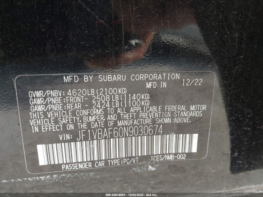 2022 SUBARU WRX 2022 року Бензин, 2.4, Повний привід, vin - JF1VBAF60N9030674 з США