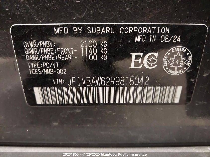 2024 SUBARU WRX 2024 року Бензин, , Повний привід, vin - JF1VBAW62R9815042 з США