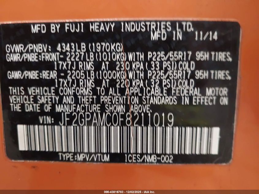 Колір АпельсиновийЦиліндри 4Привід Повний привідVIN JF2GPAMC0F8211019Стан Заводиться та їде (перевірено)Ушкодження Передня права AutoRIA