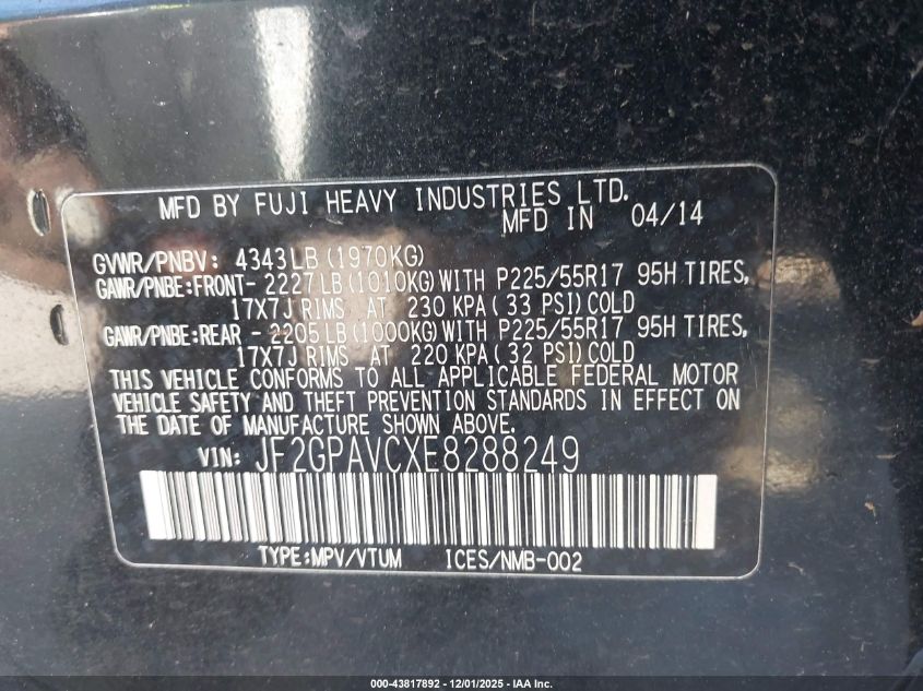 Колір ЧорнийЦиліндри 4Привід Повний привідVIN JF2GPAVCXE8288249Стан СтаціонарноУшкодження Передня або задня AutoRIA