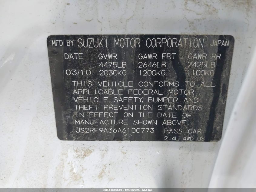Колір БілийЦиліндри 4Привід Повний привідVIN JS2RF9A36A6100773Стан СтаціонарноУшкодження Передня або задня AutoRIA