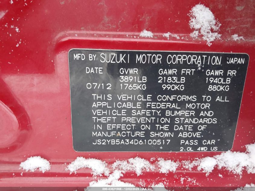 2013 SUZUKI SX4 2013 року Бензин, 2.0, Повний привід, vin - JS2YB5A34D6100517 з США